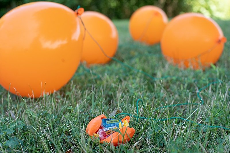 Il classico gioco del palloncino in stile Halloween, con palloncini arancioni decorati come zucche. Un gioco di Halloween adatto ai più piccoli.