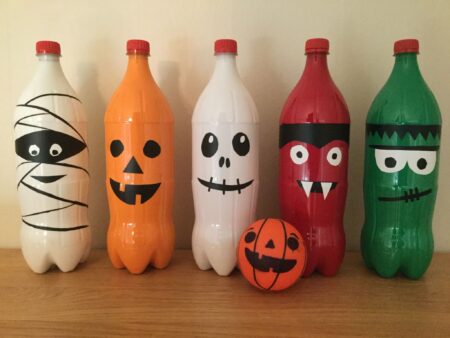 Utilizza delle bottiglie di plastica vuote, dipingile e disegna una volto su ognuna di esse. I bambini devono far cadere le bottiglie utilizzando una palla.