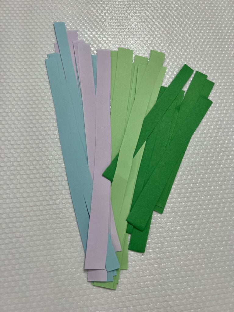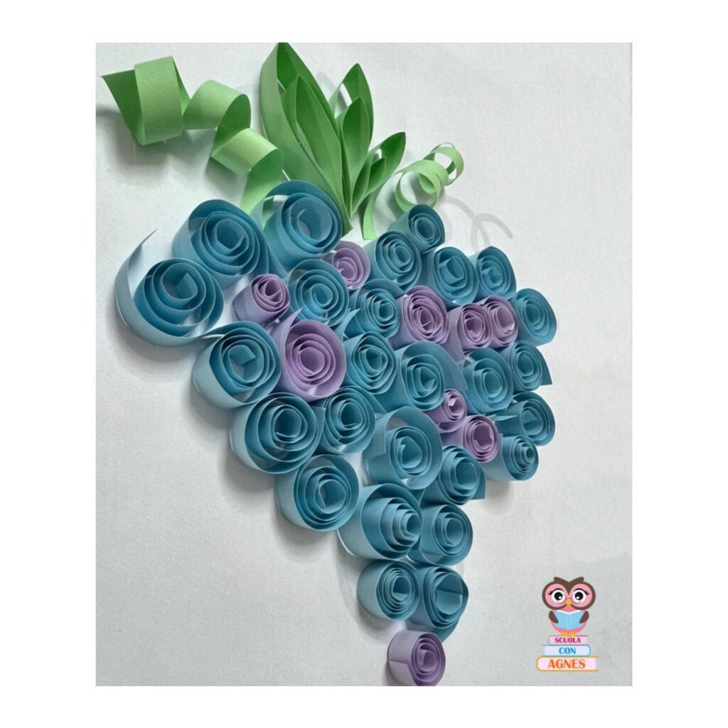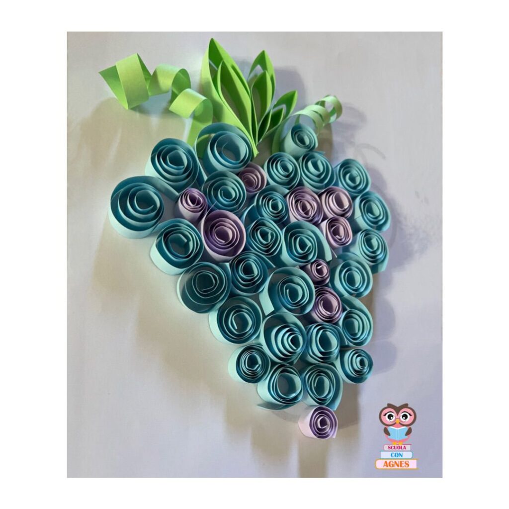 Grappolo d’uva realizzato con cartoncino colorato fine, ritagliato, arrotolato ed incollato su sagoma base.